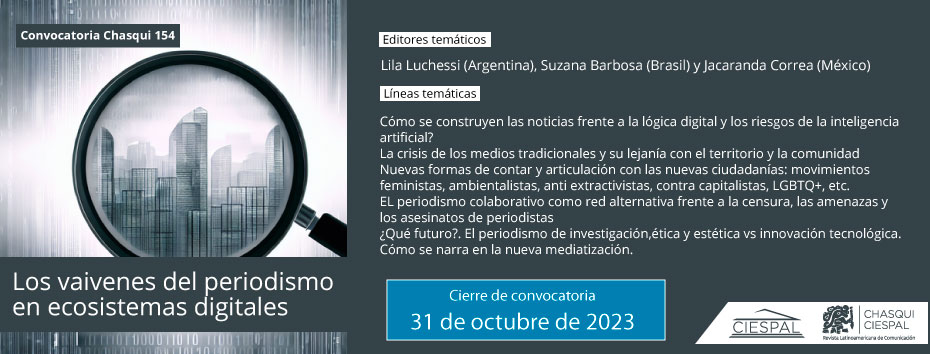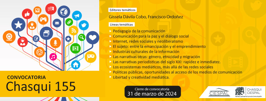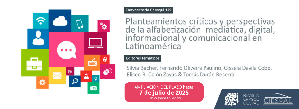 Chasqui 159. Planteamientos críticos y perspectivas de la alfabetización mediática, digital, informacional y comunicacional en Latinoamérica 2025-04-16 Leer más Leer más acerca de Chasqui 159. Planteamientos críticos y perspectivas de la alfabetización mediática, digital, informacional y comunicacional en Latinoamérica