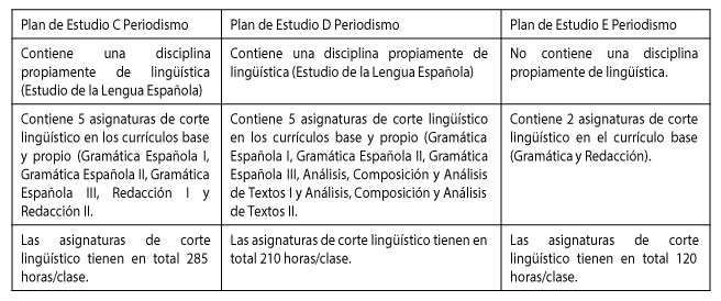 De forma muy similar sucede con los planes de estudio C, D y E de las carreras de Comunicación Social y Ciencias de la Información, donde las asignaturas de corte lingüístico han sido mucho más discriminadas tanto en la reducción de asignaturas de este tipo como en la reducción del fondo de tiempo.