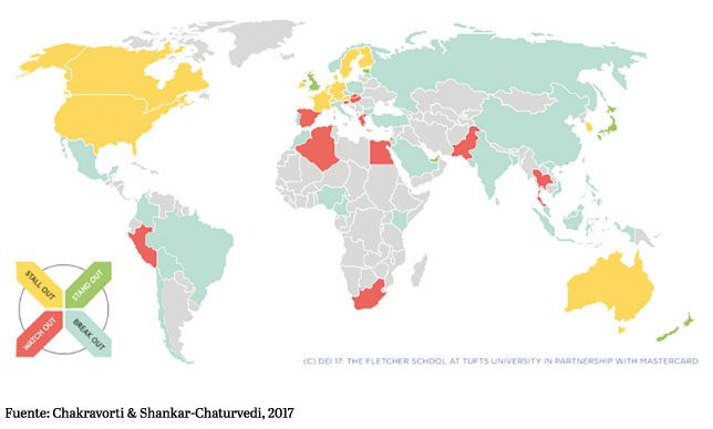 Si la digitalización constituye un hito de la historia económica y social, no todos coinciden en su impacto. Según el Digital Evolution Index 2017 (Chakravorti& Shankar-Chaturvedi, 2017), los flujos digitales son responsables de mayor crecimiento del PBI que los bienes y servicios tradicionales. Entre otros factores aparentemente irreversibles de la globalización, destacan el aumento imparable de flujos de capitales y personas, la emergencia de economías en desarrollo (fenómeno conocido como “the rise of the rest”) como la china o la india, que casi han dejado de lado el papel para digitalizar todos sus procesos, pero también la mayor inequidad en la distribución de la riqueza y la aceleración del cambio climático. Para los autores de este índice global, las economías nacionales pueden representarse en cuatro estadios: