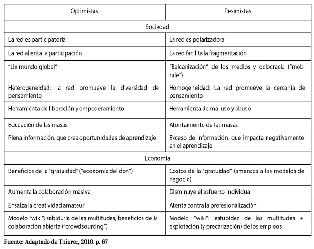 Como se observa, las dos mayores preocupaciones son, por un lado, el impacto de la digitalización en el aprendizaje y la cultura, así como el rol de los expertos y los amateurs; y por el otro, la promesa —o el riesgo— de la personalización (o la desmasificación, puesto de otra forma). En cuanto a lo primero, ejemplos como Wikipedia representan un paradigma que permite a uno y otro bando sentar posiciones concretas: los pesimistas temen la relativización de la verdad en manos de cualquier individuo con capacidad de editar el contenido de una enciclopedia, y ven el culto por lo amateur como la muerte de los expertos; en el plano político, les ocupa el desvanecimiento de la autoridad y la representación democrática y la instauración de una oclocracia o un “gobierno de las masas” bajo la ilusión de la participación directa. Los optimistas, por contrario, ven lo anterior como puertas que se abren: hablan de una inteligencia colectiva, de una solidaridad basada en el intercambio abierto e incluso el nacimiento de nuevos modelos de negocio. En cuanto a lo segundo, ambos bandos sugieren que la digitalización ha provocado una “personalización” de las experiencias mediáticas: aquí podríamos hablar de Netflix como el paradigma de producción, distribución y acceso que modela el ecosistema actual. Mientras que los optimistas hablan de la creación de entornos personalizados enriquecidos — gracias a la personalización o “customización” de todos los bienes y servicios—, los pesimistas critican cómo se empobrecen la cultura en manos de un narcisismo que fragmenta la sociedad (Thierer, 2010).