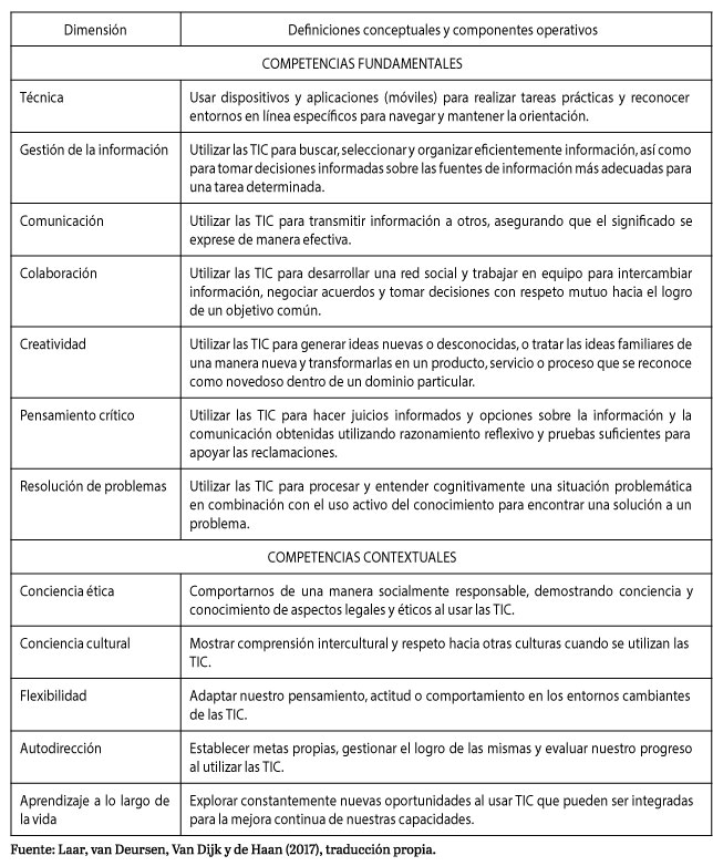 En el primer caso, Laar, van Deursen, Van Dijk y de Haan (2017) revisaron más de 1,500 artículos relativos a los cambios del siglo XXI y su relación con las nuevas competencias laborales. A partir de una revisión sistemática de 75 estudios finalmente incluidos en la muestra, propusieron siete dimensiones competenciales fundamentales: técnica, gestión de la información, comunicación, colaboración, creatividad, pensamiento crítico y resolución de problemas, así como cinco dimensiones contextuales: conciencia ética, conciencia cultural, flexibilidad, autodirección y aprendizaje a lo largo de la vida. Asimismo, ofrecieron la siguiente conceptualización operativa: