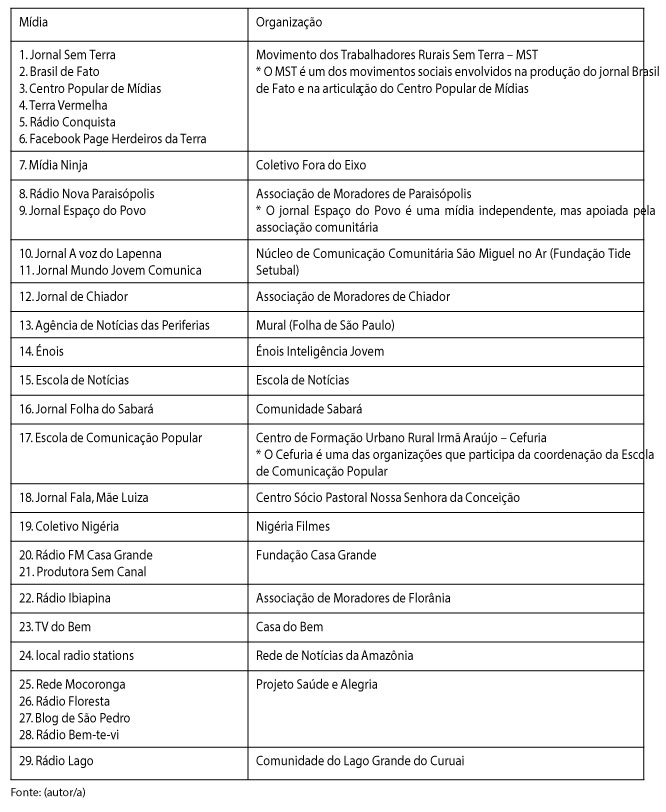 No que se refere à unidade, os estudos de caso compartilham três principais características. Primeiro, eles são todos ligados a lutas sociais, incluídos ou associados com estratégias mais amplas de movimentos sociais, ONGs ou associações comunitárias ativas na busca de uma transformação particular ou geral nas condições de vida de uma população específica. Segundo, todas as mídias se situam em condição de periferia, o que pode representar uma situação geográfica periférica ou uma marginalização moral e simbólica dos grupos sociais referidos. Finalmente, todas as mídias da amostra são de longa duração, o que significa concretamente que são plataformas criadas para acompanhar as lutas sociais na sua continuidade, em oposição a plataformas criadas especificamente para mobilização ou divulgação de eventos específicos. No que se refere à diversidade, as características específicas se referem à região geográfica; à condição socioeconômica do contexto em que a mídia está situada; ao tipo de plataforma tecnológica utilizada; e ao tipo de vínculo institucional.