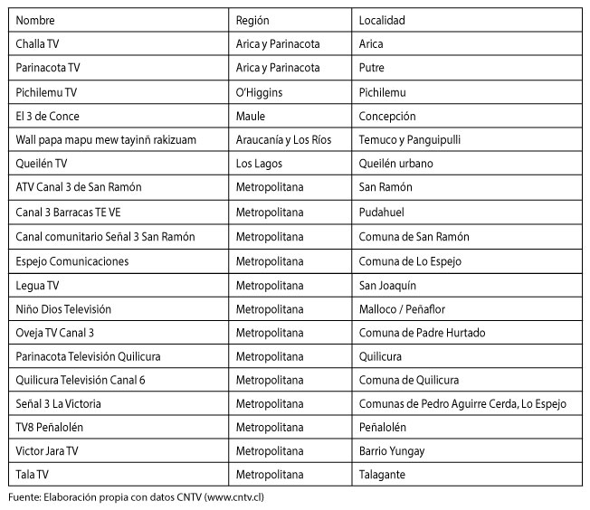 Antes de la promulgación de la Ley 20.750, el sector de la televisión comunitaria se encontraba sin sustento legal. Sáez et al. (2012) lograron distinguir 3 tipos de canales comunitarios existentes: poblacional, que surge en determinado sector y con una historia común, como los campamentos; canales de desarrollo local, que surge en un territorio más amplio, no necesariamente con una historia en común; y, los de desarrollo social y cultural que surgen para el desarrollo de los barrios que los emiten. Se catastraron 19 experiencias de televisión comunitaria de los diferentes tipos. En la Tabla 1 se detallan esos canales, según su región y localidad de operación.