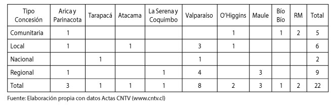 Al sistematizar la información contenida en las actas, fue posible determinar que: de las 37 frecuencias adjudicadas para televisión nacional, regional, local y comunitaria, sólo 22 ya han sido otorgadas en forma definitiva. Según se señala en la Tabla 1, cinco de ellas corresponden a señales de tipo comunitario, seis a frecuencias locales, 9 regionales y dos de alcance nacional, según se puede apreciar en la Tabla 2.