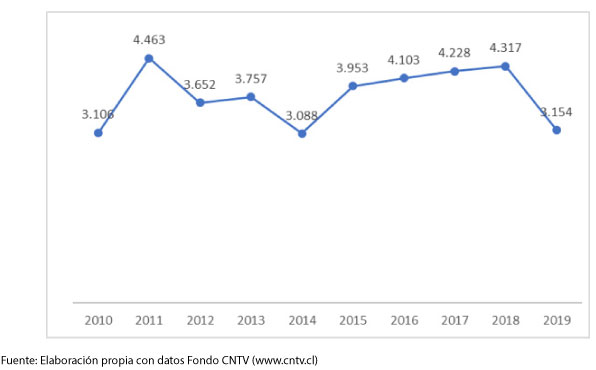 En la Figura 1 se detallan los montos otorgados desde el año 2010 cercanos a los 3100 millones de pesos chilenos. El monto asignado a subsidiar la televisión alcanzó su punto más alto en 2011 alcanzando los 4.463 millones de pesos. Entre los años 2016 y 2018 los montos superaron nuevamente los 4.000 millones de pesos. El año 2019 coincidiendo con el cambio de gobierno, el monto cae a niveles similares al año 2010, lo que significará un importante retroceso para la industria televisiva en general.