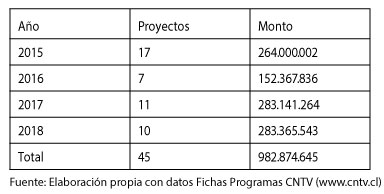 Respecto del financiamiento de proyectos vinculados con la televisión digital, se analizaron dos fondos específicamente diseñados. El primero, vinculado a los contenidos, es Fondo de Fomento a la Calidad de Programas de Carácter Comunitario del CNTV, surgido en 2015. Se analizaron las Bases del Concurso (de los años 2015 a 2019), las Fichas de Programas Fondo CNTV (disponibles en la web https://www.cntv.cl/fichas-programas-fondo-cntv/cntv/2018-07-04/120444.html) y otros datos de la página del Consejo respecto del Fondo CNTV general.