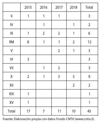 Según las bases de 2015, el Fondo estaba destinado a las productoras comunitarias entendiendo que son aquellas las “localizadas dentro del territorio de una organización y que tienen por objeto representar y promover audiovisualmente los valores e intereses específicos de su comunidad” (CNTV 2015, p. 2). Se estipulaba que el monto asignado sería de 264 millones de pesos, con un tope de 30 millones por proyecto. Se adjudicaron 17 proyectos de 7 regiones del país, tal como se puede ver en las Tablas 3 y 4.