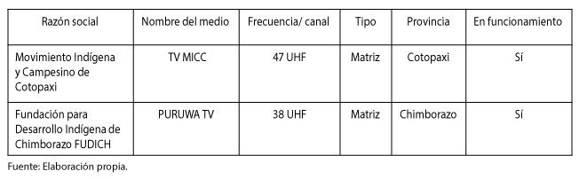Por otro lado, en la provincia de Cotopaxi y Chimborazo, existen dos canales de televisión comunitarios, en Tungurahua el canal comunitario pertenece a una organización religiosa con matriz en la ciudad de Quito. A pesar de que la mayor población indígena del Ecuador se asienta en dichas provincias. Roberto Sánchez Montoya (2013) manifiesta que “en el caso ecuatoriano se tomó el modelo boliviano del 34% para la comunicación sin fines de lucro, pero sin incidir en la diferenciación entre organizaciones no gubernamentales y nacionalidades o pueblos originarios” (Sánchez, 2013, p. 166).