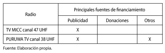 La sostenibilidad económica es un pilar fundamental para el funcionamiento del canal de televisión. Es así que, para mantener operativo el canal de televisión, se requiere entre 1.500 a 3.000 dólares mensuales. Los recursos son empleados para el pago de servicios básicos y al personal que colabora en el medio, es cubierto principalmente por la publicidad de instituciones públicas y privadas, en el caso de TV MICC. Por otra parte, años atrás el medio de comunicación recibía donaciones de organizaciones internacionales. En los últimos años han sido limitadas por los trámites burocráticos impuestos por el estado ecuatoriano. Puruwa TV, al haber iniciado sus transmisiones recientemente no tenía publicidad. Se financiaba por el pago de transmisiones que realizan en las organizaciones indígenas como la Fundación para el Desarrollo Indígena de Chimborazo (FUDICH). Durante el segundo semestre del año 2019 han introducido publicidad. En la Tabla 3 se expone las principales fuentes de financiamiento del canal de televisión en la región central de Ecuador.