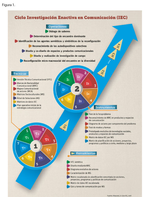 La articulación de técnicas, herramientas e instrumentos IEC constituye un proceso concatenado específicamente para propiciar el cambio social conversacional en los territorios bajo investigación. La investigación a la que refiere este artículo se focaliza en sintetizar y protocolizar a la IEC como un proceso complejo y fluido que incluye diferentes operaciones cognitivas que se realizan sobre la base de otras anteriores. Busca avanzar en torno a la ampliación de las competencias investigativas del comunicador a partir de identificar y correlacionar elementos conceptuales, dinámicos y performativos vinculados a la comunicación como disciplina y, a la vez, como metaperspectiva inter y trans-disciplinaria.