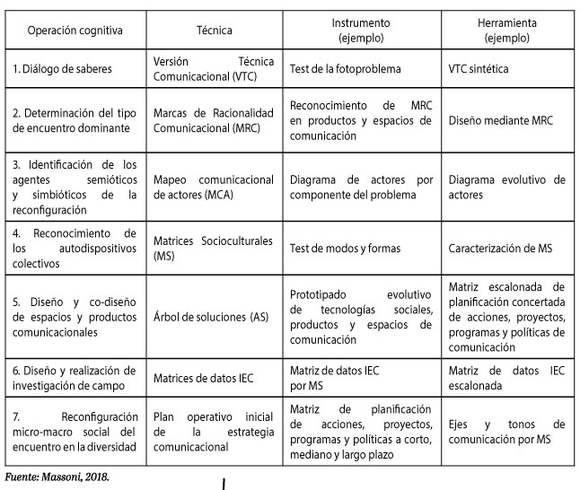 Sobre esa base de datos empíricos se definirán los componentes de la teoría emergente5 (Strauss & Corbin, 2002) mediante la identificación y examen comparativo de técnicas, herramientas e instrumentos que se incluyen en la Tabla 1 la cual permitirá tensionar cada uno de los interrogantes planteados en torno a la integración de procesos cognitivos al interior de una IEC. El diálogo de saberes es la operación cognitiva inicial en una IEC. Implica partir del reconocimiento de que hay saberes válidos y socialmente necesarios, generados fuera del ámbito académico, con los que los comunicadores universitarios deben dialogar para abordar lo que con frecuencia no permite ver la mirada disciplinaria y disciplinada, fragmentada y analítica de las ciencias sociales tradicionales. La comunicación como encuentro, como conversación micro/ macro social, implica esta consideración de lo complejo y de lo fluido en tanto modalidad de la relación intersubjetiva propia de lo comunicacional. No es una descripción de la complejidad, sino una búsqueda de la complejidad a partir de la comunicación como modalidad siempre abierta a nuevas acciones y sentidos compartidos6 .