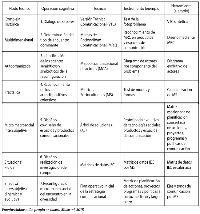 4 Un tipo de investigación en ciencias sociales que aporta a la vez a una metaperspectiva centrada en equipos de investigación inter y transdisciplinar, y a la comunicación como disciplina científica (Massoni 2016). Implica el despliegue de una estrategia comunicacional definida como algoritmo fluido. Incluye un conjunto de técnicas, instrumentos y herramientas que permiten examinar distintas dimensiones comunicacionales en términos de tipos de encuentro en la diversidad, a la vez que operar reconfiguraciones intersubjetivas micro-macro sociales desde la dimensión comunicacional en bucles dinámicos y evolutivos de complejidad creciente en las distintas fases de la investigación (Massoni, 2013).