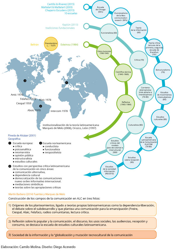 Sin embargo, más allá del esquematismo de estas clasificaciones, Martín Barbero (2014) sugiere su comprensión a partir del contexto de la construcción de los campos de la comunicación en ALC, estableciendo tres hitos importantes en los últimos cincuenta años: