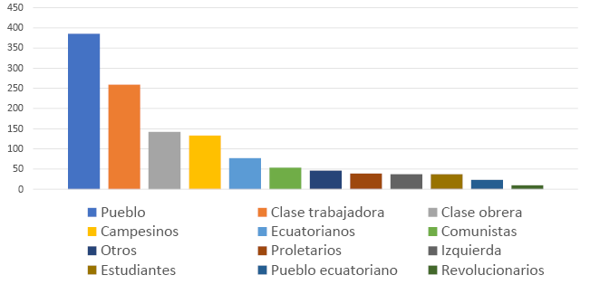 No obstante, si desgranamos este resultado, comprobamos que la palabra más utilizada es pueblo (ideología), seguida de clase trabajadora, clase obrera (clase) y campesinos (propiedad de la tierra) (Figura 2).17