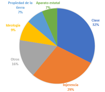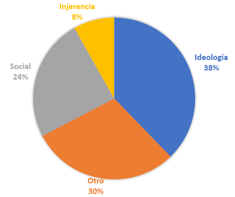 Algo parecido ocurre con el adversario externo, cuya conceptualización ofrece orígenes de “clase” e “injerencia” con similar frecuencia (Figura 3), aunque el primero es superior en número. Cabe aquí una particularidad, y es que términos que no podían ser clasificados y que, por tanto, figuran como “otros”, ocupan el tercer lugar. Con ellos, nos referimos a descalificaciones de uso común, y no a denominaciones de carácter político.
