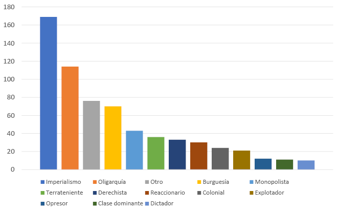 Una vez más, si examinamos la terminología concreta que se emplea (Figura 4), obtenemos matices que dan muestra de la singularidad discursiva de los Partidos en Latinoamérica (y su concreción ecuatoriana), y que está atravesada por la experiencia histórica de la colonización. Así, las acusaciones al imperialismo sobrepasan a las realizadas al enemigo de clase, que a su vez también queda descrito a través del lenguaje típico del populismo latinoamericano, la oligarquía (Puiggrós, 2006). La burguesía, fórmula preferida por el marxismo de corte soviético, queda recluida al cuarto lugar, lejos de las prioridades lingüísticas.