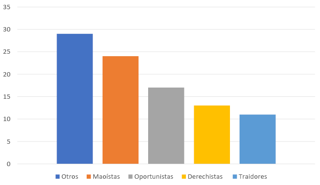 Respecto al adversario interno (aquel que forma parte de la clase trabajadora, pero se opone a los intereses del Partido), de nuevo las lógicas nacionales o regionales se impusieron a las directrices importadas. En este sentido, adversarios como el trotskismo, la socialdemocracia o el anarquismo pasaron inadvertidos frente a la disputa local con el maoísmo. Como ya se ha señalado, este sector protagonizó una escisión organizándose alrededor del PCMLE e iniciando una confrontación que se mantuvo durante décadas, convirtiéndose en rivales electorales y compitiendo por la hegemonía del marxismo ecuatoriano. De este modo, y aunque no son temáticas recurrentes en El Pueblo, el origen del adversario interno es principalmente ideológico (Figura 5), y se expresa a través de términos como “chinos”, “maoístas” o “pseudoizquierda” (Figura 6). Estas apelaciones críticas con el maoísmo desaparecen por completo en 1989 y 1990, producto del acuerdo alcanzado entre MPD y FADI para concurrir juntos a las elecciones presidenciales. De manera parecida a lo que ocurría con el adversario externo, la categoría “otros” (descalificaciones comunes) se encuentra como la más mencionada, y le siguen otras de origen social o de injerencia.