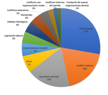 Si observamos los datos por períodos, evidenciamos que la tendencia a reproducir las mismas temáticas se mantiene. Esto podría parecer que no revela nada. Sin embargo, si tenemos en cuenta que la realidad es cambiante, se antoja particular que no lo hiciesen los contenidos. Esta continuidad temática podría reforzar la idea de que esta prensa fue unidireccional, operando sólo para informar y no para formar a sus lectores, contradiciendo la fórmula leninista de que la prensa obrera debería permitir estudiar, hacer propaganda y organizar. Prestando mayor atención, los comunicados publicados nunca se convirtieron en “la otra opinión” (Archila Neira, 1986) o en el “vehículo divulgador del ideal libertario” (Colodrón Valbuena, 2016), sino que funcionaron como la única opción posible.