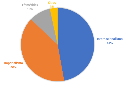 Respecto a las temáticas internacionales (Figura 8), El Pueblo dedicó más espacio a contenidos positivos sobre partidos y organizaciones comunistas en el extranjero -sobre todo, en América Latina y la Unión Soviética- que a denunciar las injerencias de los gobiernos enemigos -Estados Unidos, su bloque, y las dictaduras militares regionales-. Este resultado es aún más abultado si se suman las efemérides internacionales, que en su amplia mayoría recogen relatos simpáticos con el personaje fallecido.