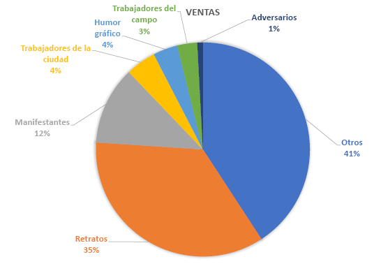 Por último, hemos analizado también las representaciones visuales (Figura 9). En este sentido, los retratos son la categoría unificada más utilizada. Las imágenes son, por tanto, preferidas para ilustrar a personajes protagonistas de los contenidos, reforzando así cierta querencia por los liderazgos, cuestión compartida tanto por el populismo como por el comunismo marxista de corte soviético. A estos, les siguen imágenes de manifestantes y de trabajadores de la ciudad. Una vez más, la línea entre una estrategia popular y otra clasista. Como ocurría con los contenidos y términos, los campesinos son representados en una proporción muy inferior al resto de sectores, ahondando en la posibilidad de que fuesen considerados de manera lateral para el proceso de cambio.