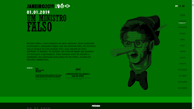 As afrontas do governo e arbitrariedades políticas levaram o Greenpeace a lançar uma página específica com informações, a governodadestruicao.org, que elenca mês a mês, durante o ano de 2019, os prejuízos ambientais acarretados pelas decisões, especialmente, do Ministério do Meio Ambiente, a partir de notas explicativas e hiperlinks para as notícias referentes, publicadas pelos veículos de comunicação convencionais. A construção narrativa mais cômica, direta, de exageros nos textos e nas imagens dialogam com a proposta do culture jamming e da comunicação por afetação. Vemos aqui a tentativa de ser assimilável e atrativo, para além de dar fôlego para os temas em conflito. Ao mesmo tempo, é interessante notar o vínculo com a mídia convencional, em uma espécie de curadoria de notícias de interesse, e a proposta de engajamento mais direto, por meio das petições. Entretanto, não estimamos uma abrangência considerável por não ser um conteúdo em destaque no portal e não constar com frequência e notoriedade nas redes sociais digitais, por exemplo. A plataforma foi encontrada aleatoriamente em uma postagem de notícia do portal, constante na página inicial.