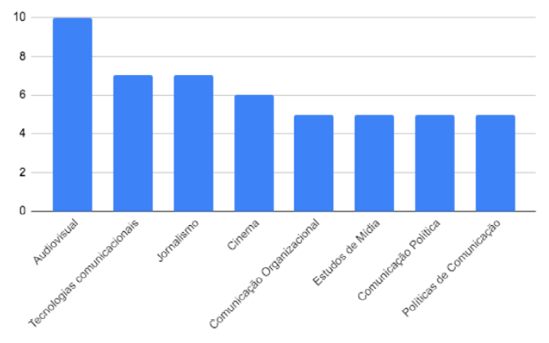 Dos temas, 23 aparecem mais de uma vez – os mais citados são audiovisual, mencionado em 10 publicações, tecnologia e jornalismo, com sete menções cada, cinema (6), comunicação organizacional e relações públicas (5) e estudos de mídia (5). Nota-se, de um lado, a presença de temáticas voltadas para o estudo das práticas e habilitações profissionais, como Jornalismo, Relações Públicas e Comunicação Organizacional (mas não Radialismo ou Publicidade e Propaganda), bem como a predominância das questões de tecnologia e audiovisual – elementos que, de certa maneira, se apresentam como dominantes no ambiente contemporâneo das mídias.